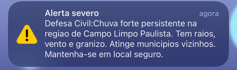 Por volta das 16h15 desta terça-feira (24), moradores da região receberam em seus celulares um alerta severo da Defesa Civil sobre chuva forte persistente em Campo Limpo Paulista e municípios vizinhos. A notificação informou risco de raios, ventos intensos e