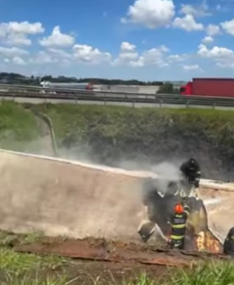 Carreta tomba, pega fogo e interdita vias no trevo das rodovias