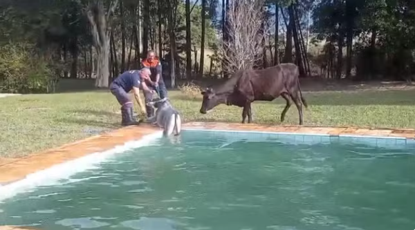Bezerro cai em piscina e vaca ‘comemora’ resgate com rebanho no interior de SP