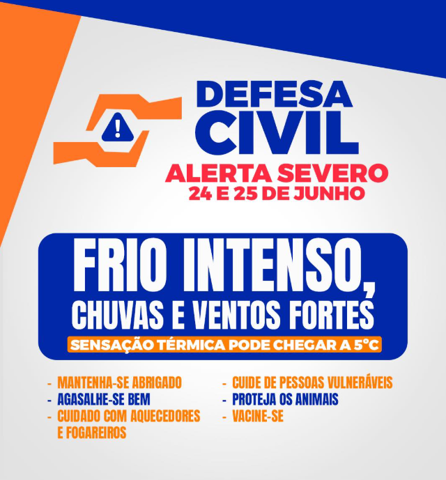 Frio intenso, chuvas e ventos fortes nos próximos dias! A Defesa Civil está em alerta com a chegada de uma massa de ar polar que vai derrubar as temperaturas. A sensação térmica pode chegar a 5°C, com previsão de chuvas e ventos fortes. ⚠️ Proteja sua família, os idosos, crianças e animais. 📞 Em caso […]