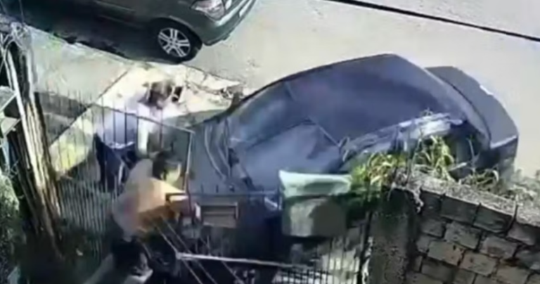 As imagens mostram o carro atingindo as vítimas, dando marcha à ré e acelerando novamente, destruindo o portão da residência. O casal conseguiu se esquivar, e o carro bateu na parede.