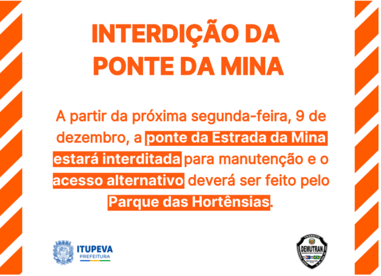 A partir da próxima segunda-feira, 9 de dezembro, a ponte da Estrada da Mina estará interditada para manutenção e o acesso alternativo deverá ser feito pelo Parque das Hortênsias.