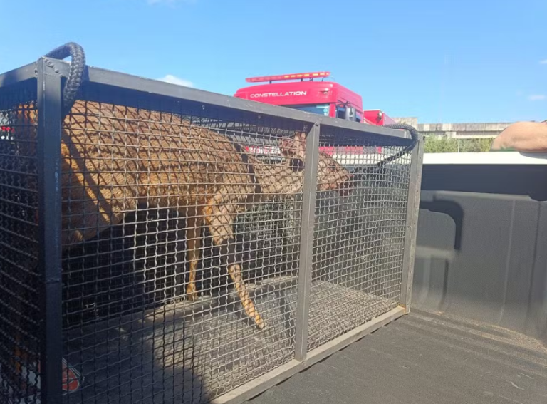 Guarda Civil Ambiental e a Defesa Civil acionaram o Corpo de Bombeiros de Jundiaí (SP) para ajudar na captura e no transporte do animal.